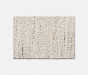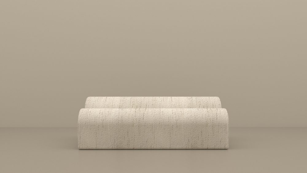Banc de salon ou banquette d’entrée habillée de jacquard bouclette irrégulière à l’aspect flammé Dedar ivoire.