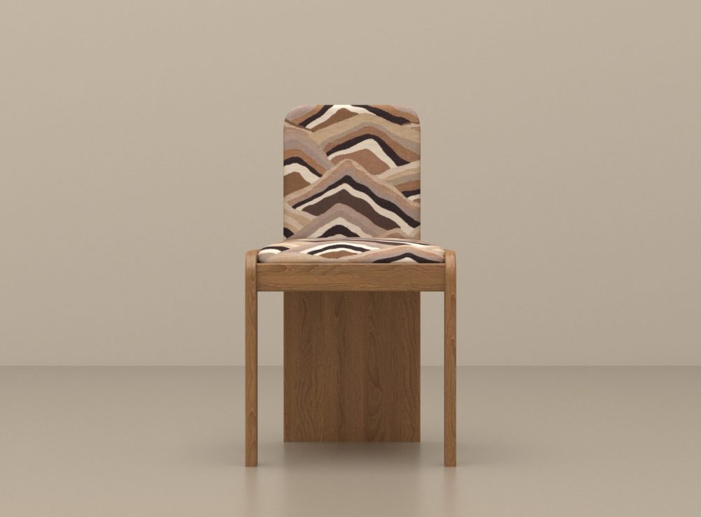 TOTEM 03 : structure en chêne naturel verni, assise et dossier tapissés mousse haute densité et tissu jacquard coton et lin Schumacher.