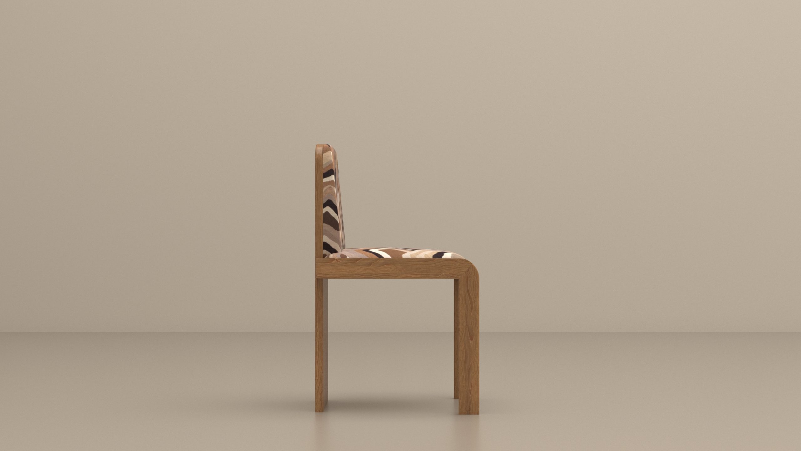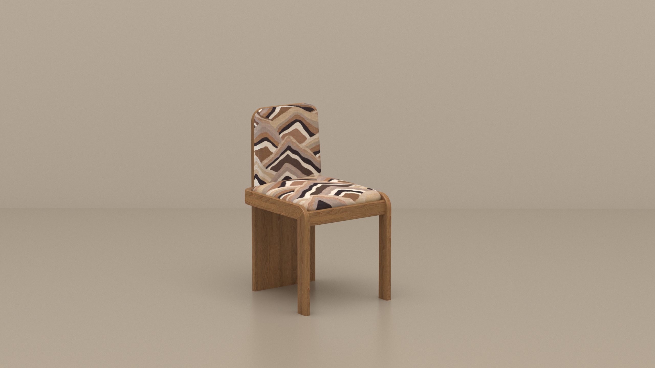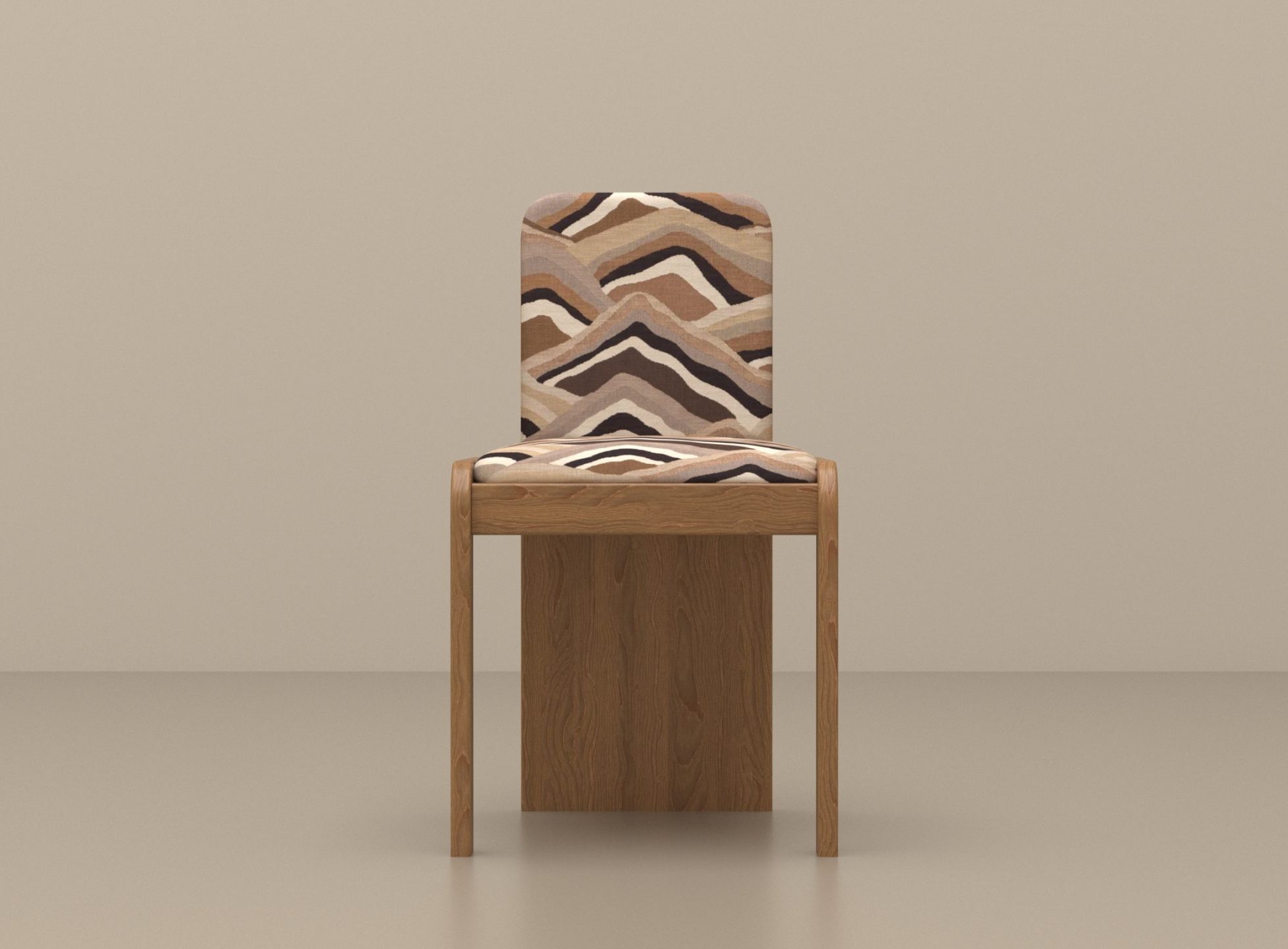 TOTEM 03 : structure en chêne naturel verni, assise et dossier tapissés mousse haute densité et tissu jacquard coton et lin Schumacher.