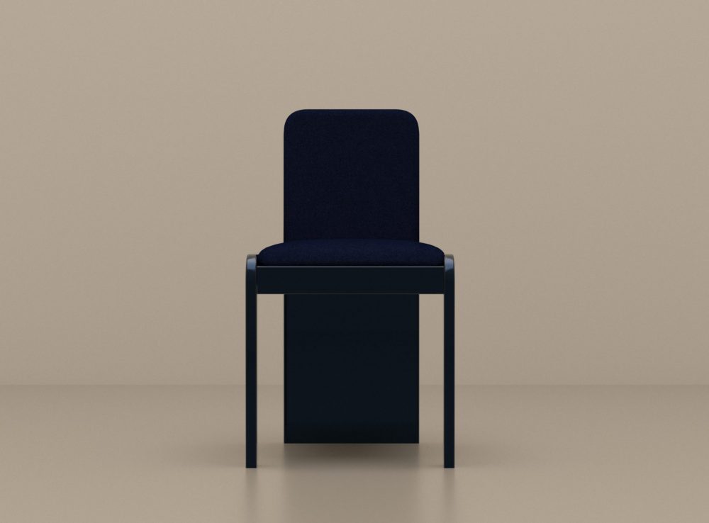 TOTEM 01 : structure en bois laqué Beu Nuit, assise et dossier tapissés mousse haute densité et drap de laine coordonné.