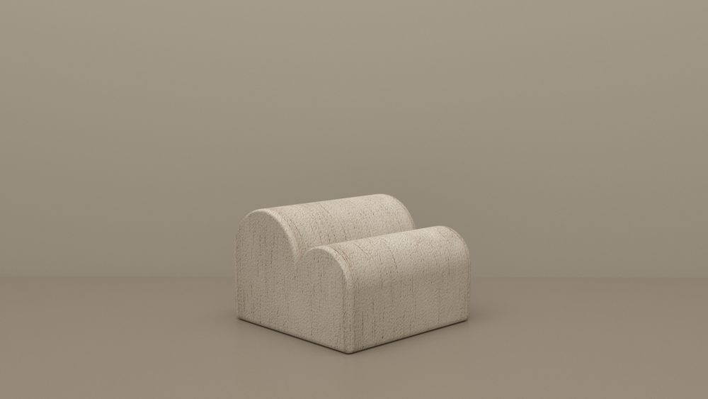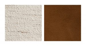 Chauffeuse de salon ou banquette d’entrée habillée de jacquard bouclette irrégulière à l’aspect flammé Dedar ivoire, ou de cuir daim havane.