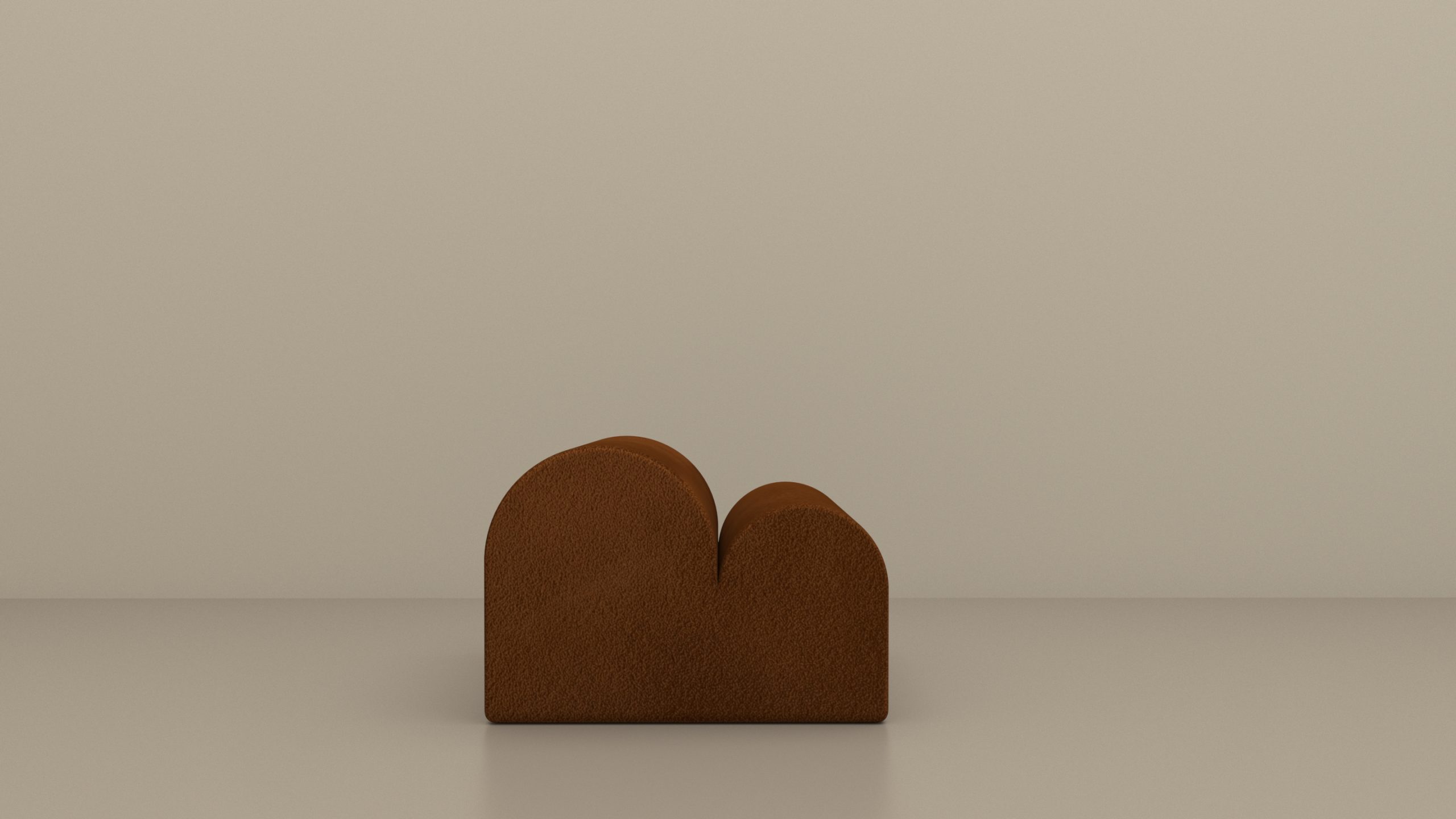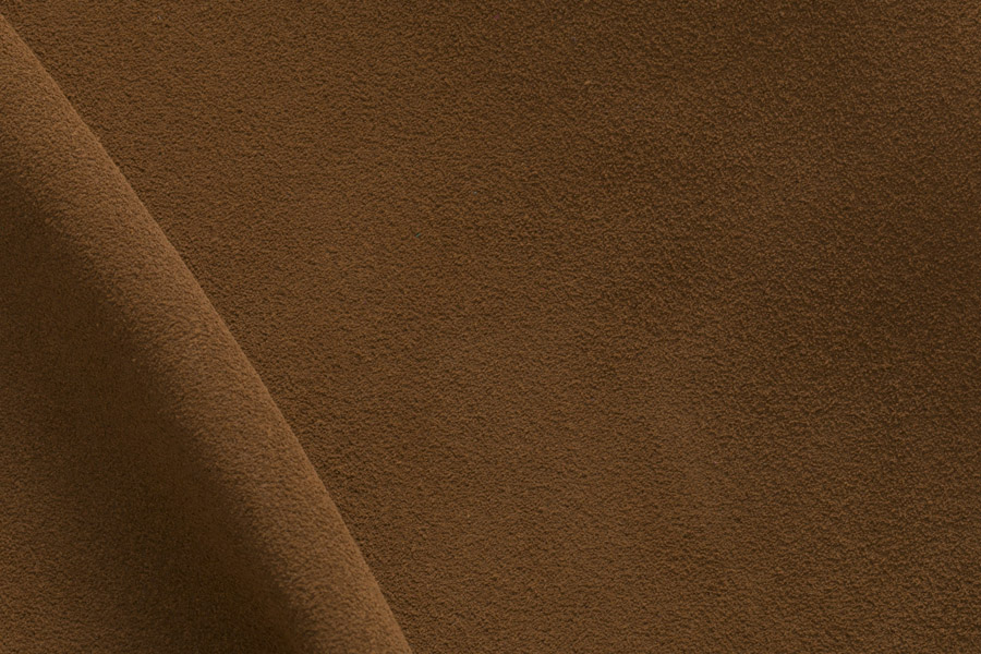 Chauffeuse de salon ou banquette d’entrée habillée de jacquard bouclette irrégulière à l’aspect flammé Dedar ivoire, ou de cuir daim havane.