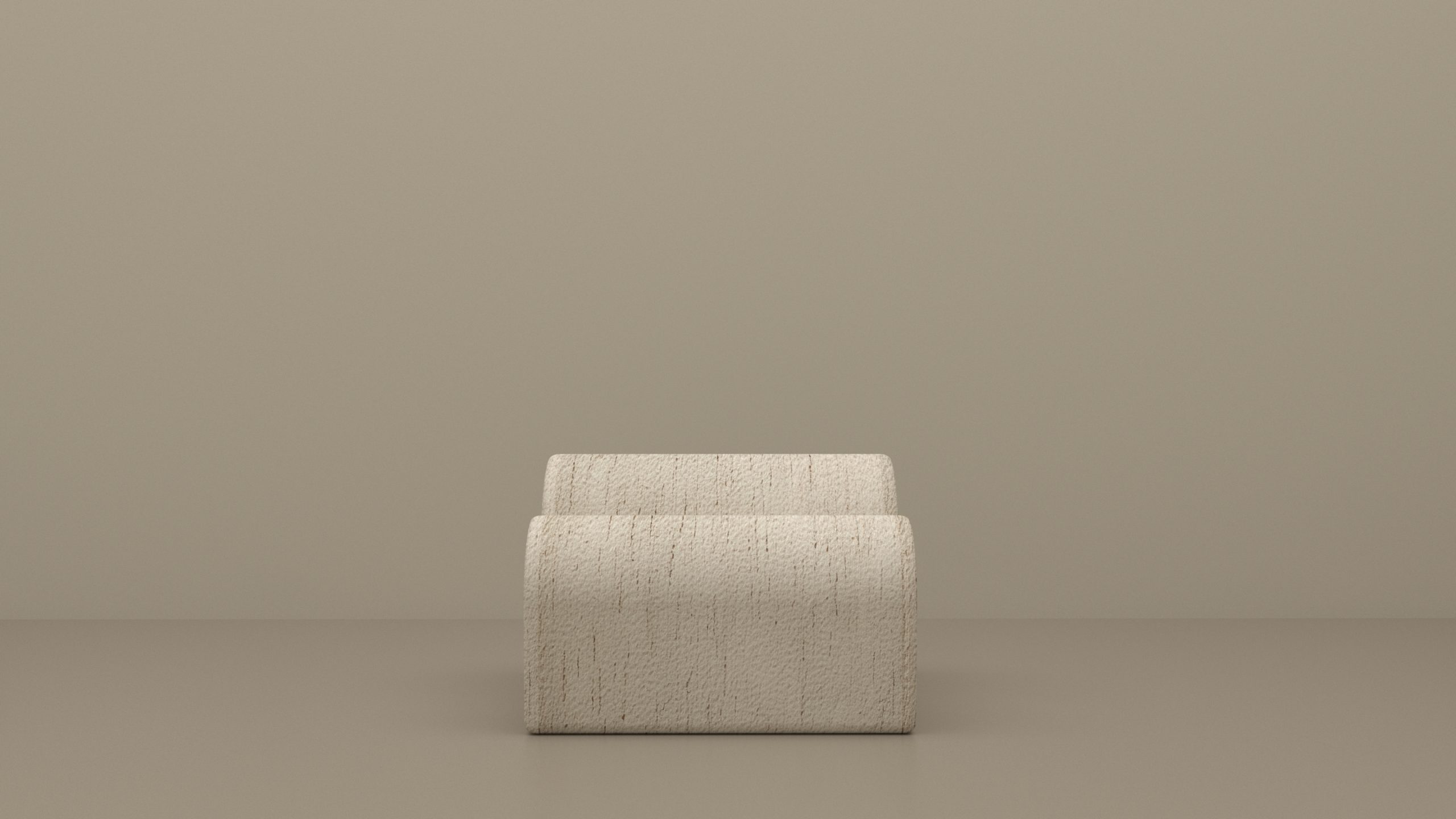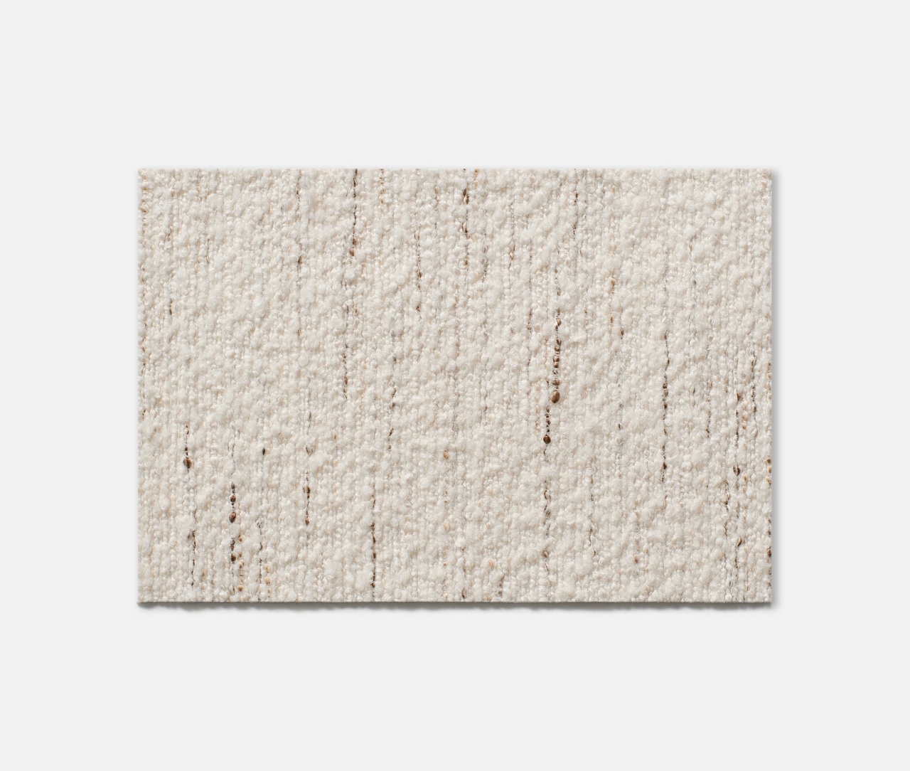 Chauffeuse de salon ou banquette d’entrée habillée de jacquard bouclette irrégulière à l’aspect flammé Dedar ivoire, ou de cuir daim havane.