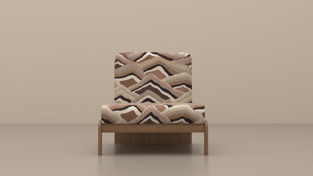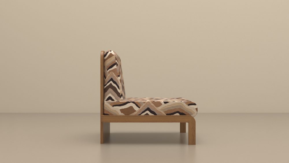 TOTEM 03 : structure en chêne naturel verni, assise et dossier tapissés mousse haute densité et tissu jacquard coton et lin Schumacher.