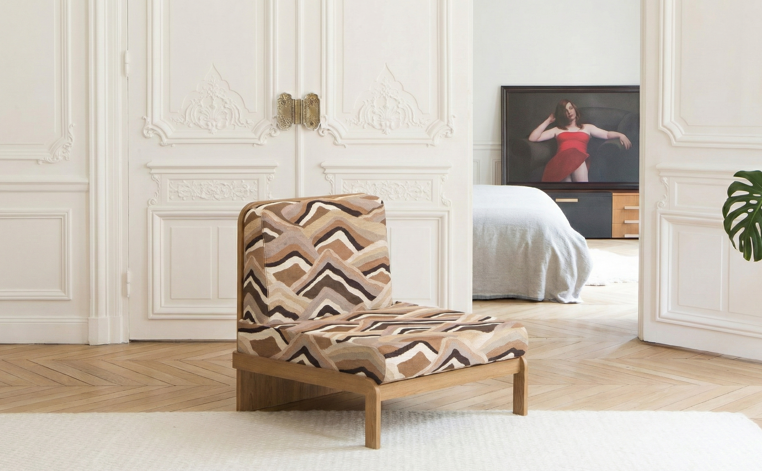 TOTEM 03 : structure en chêne naturel verni, assise et dossier tapissés mousse haute densité et tissu jacquard coton et lin Schumacher.