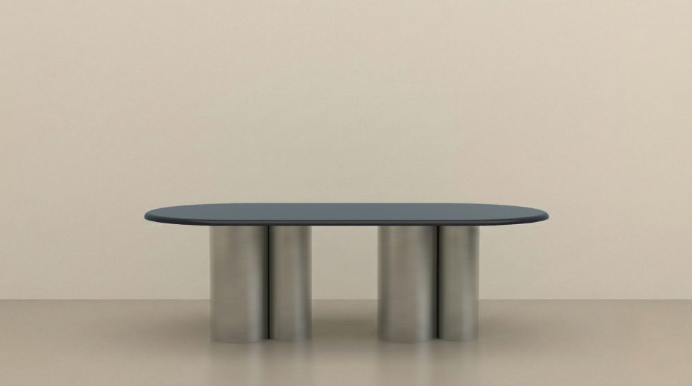Table de salle à manger oblongue BOLD large en bois laqué Bleu Nuit et piètement aluminium façon inox brossé.