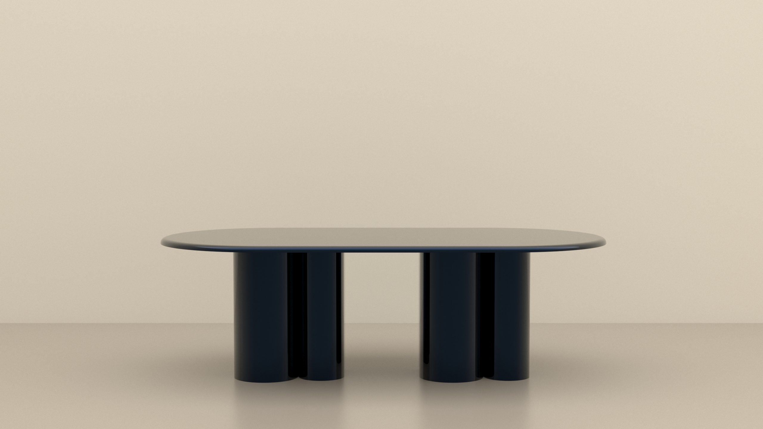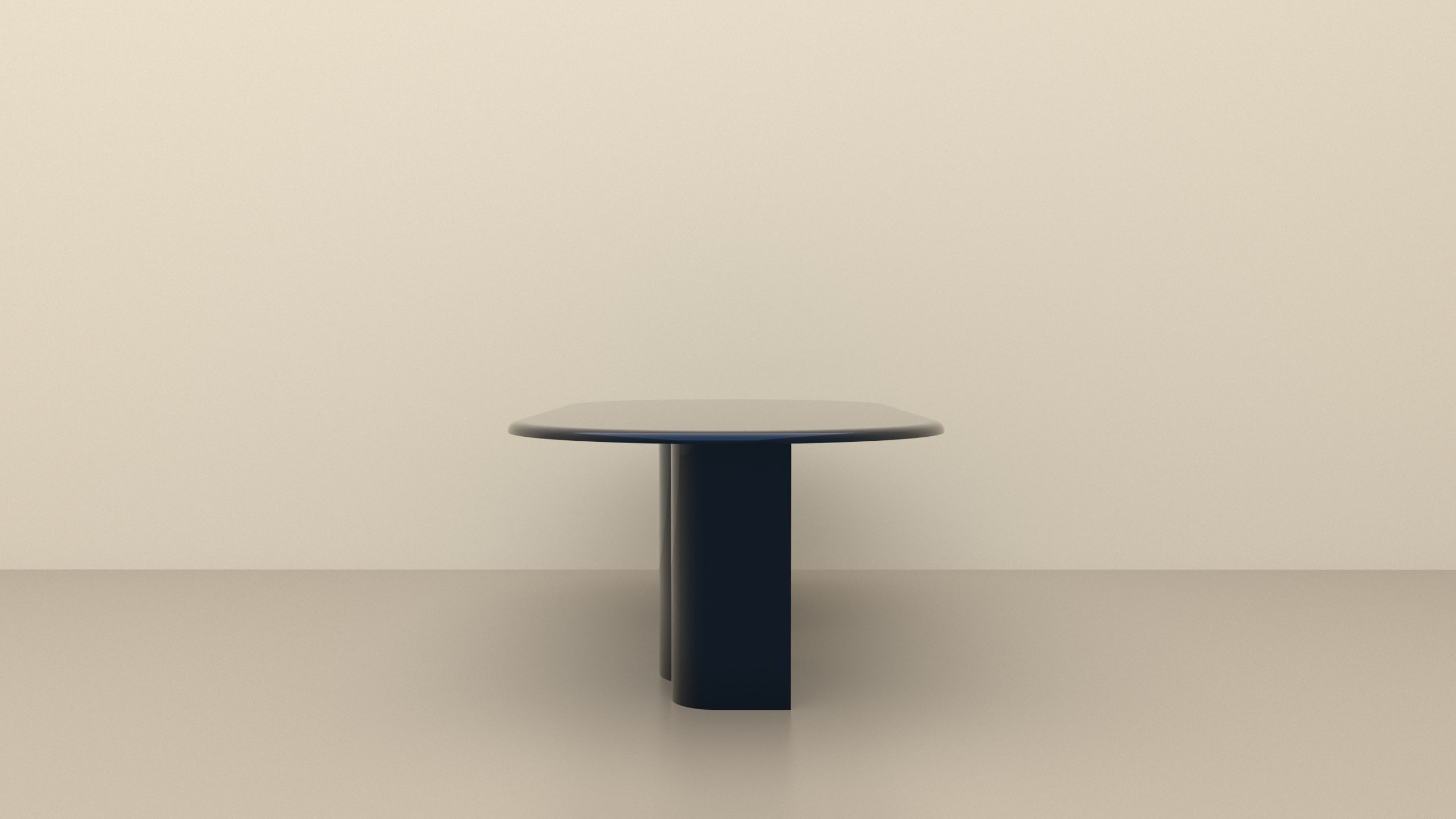 Double piètement et plateau en bois laqué Bleu Nuit.