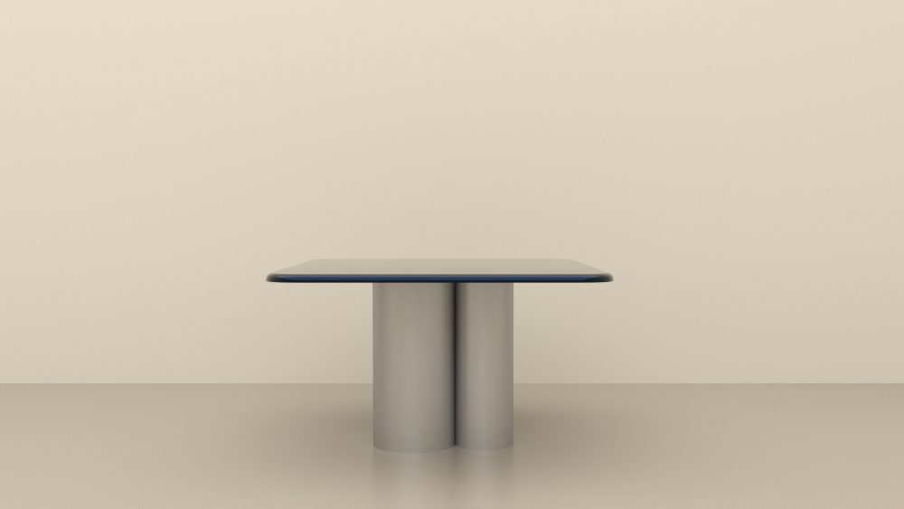 Table de salle à manger BOLD square, six déclinaisons de matériaux et couleurs. Ici, piètement en métal inox et plateau en pierre de lave émaillée Bleu Nuit.