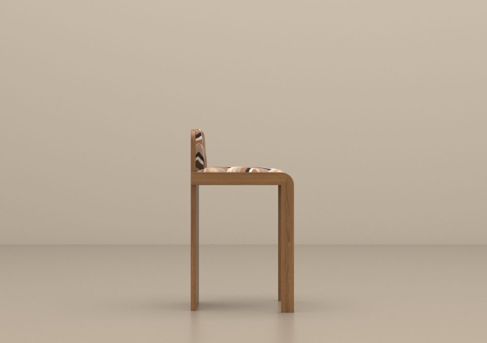 TOTEM 03 : structure en chêne naturel verni, assise et dossier tapissés mousse haute densité et tissu jacquard coton et lin Schumacher.