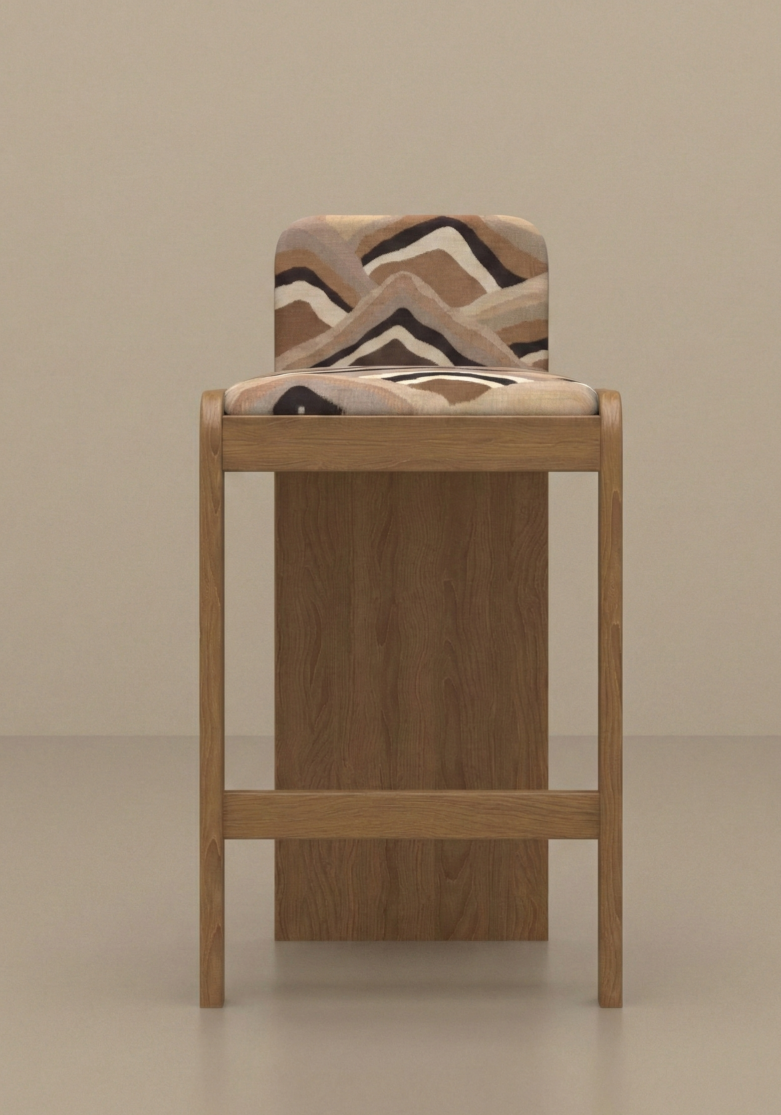 TOTEM 03 : structure en chêne naturel verni, assise et dossier tapissés mousse haute densité et tissu jacquard coton et lin Schumacher.