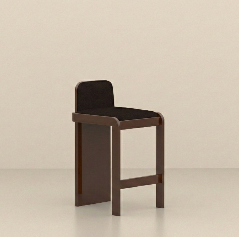 Tabouret haut de bar ou îlot de cuisine en bois laqué Chocolat, assise et dossier tapissés mousse haute densité et drap de laine chiné coordonné.