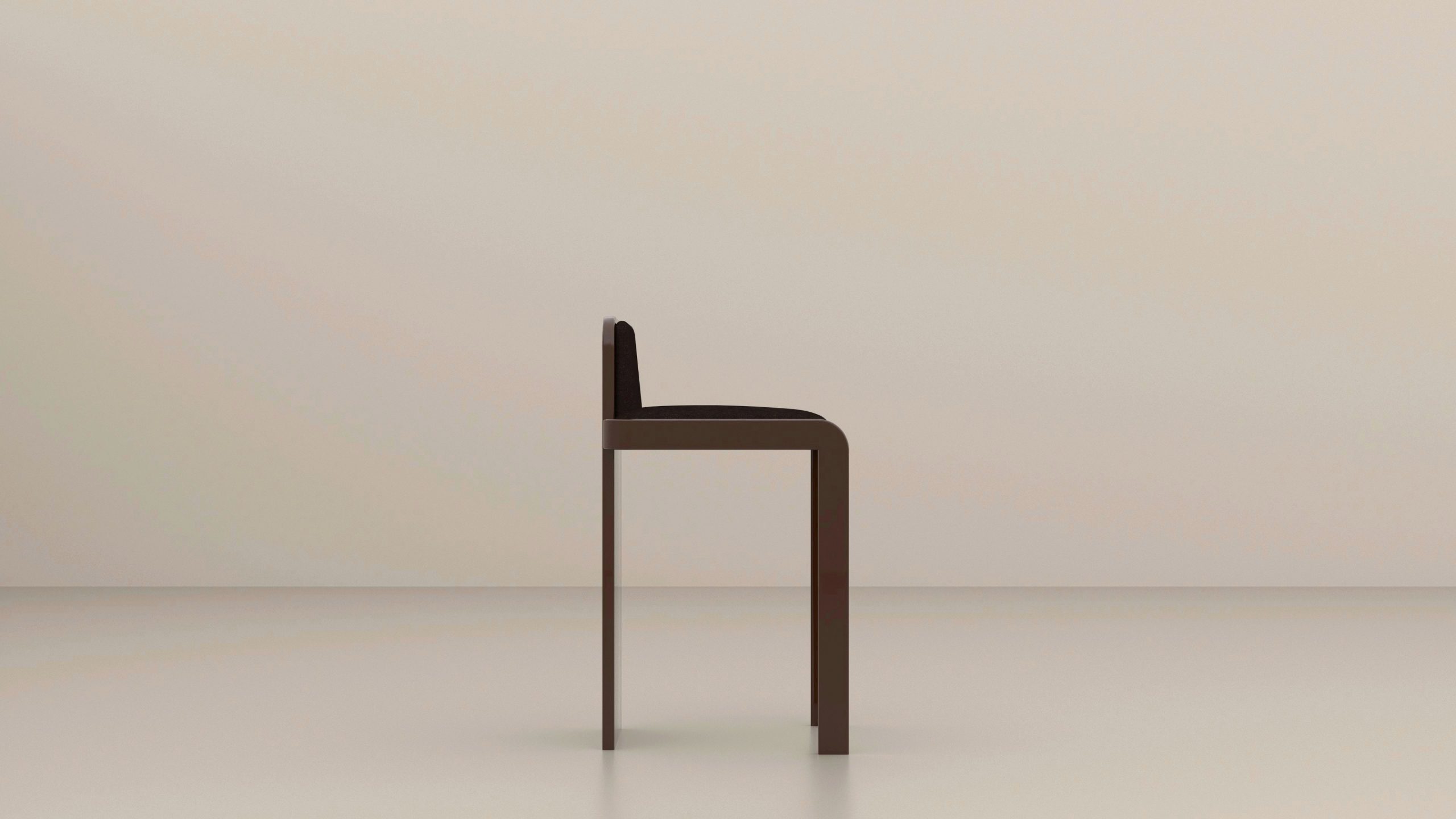 TOTEM 02 : structure en bois laqué Chocolat, assise et dossier tapissés mousse haute densité et drap de laine chiné coordonné.