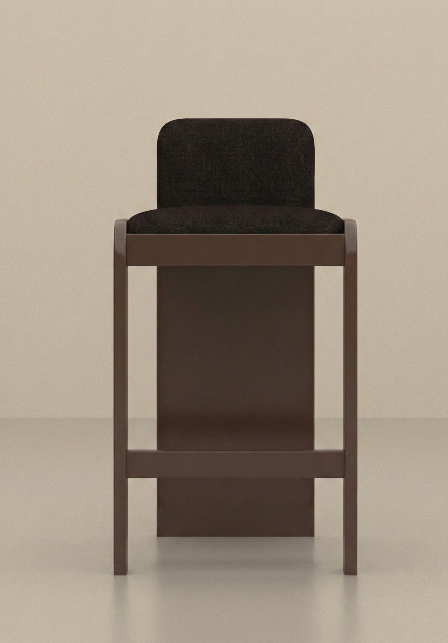 Tabouret haut de bar ou îlot de cuisine en bois laqué Chocolat, assise et dossier tapissés mousse haute densité et drap de laine chiné coordonné.