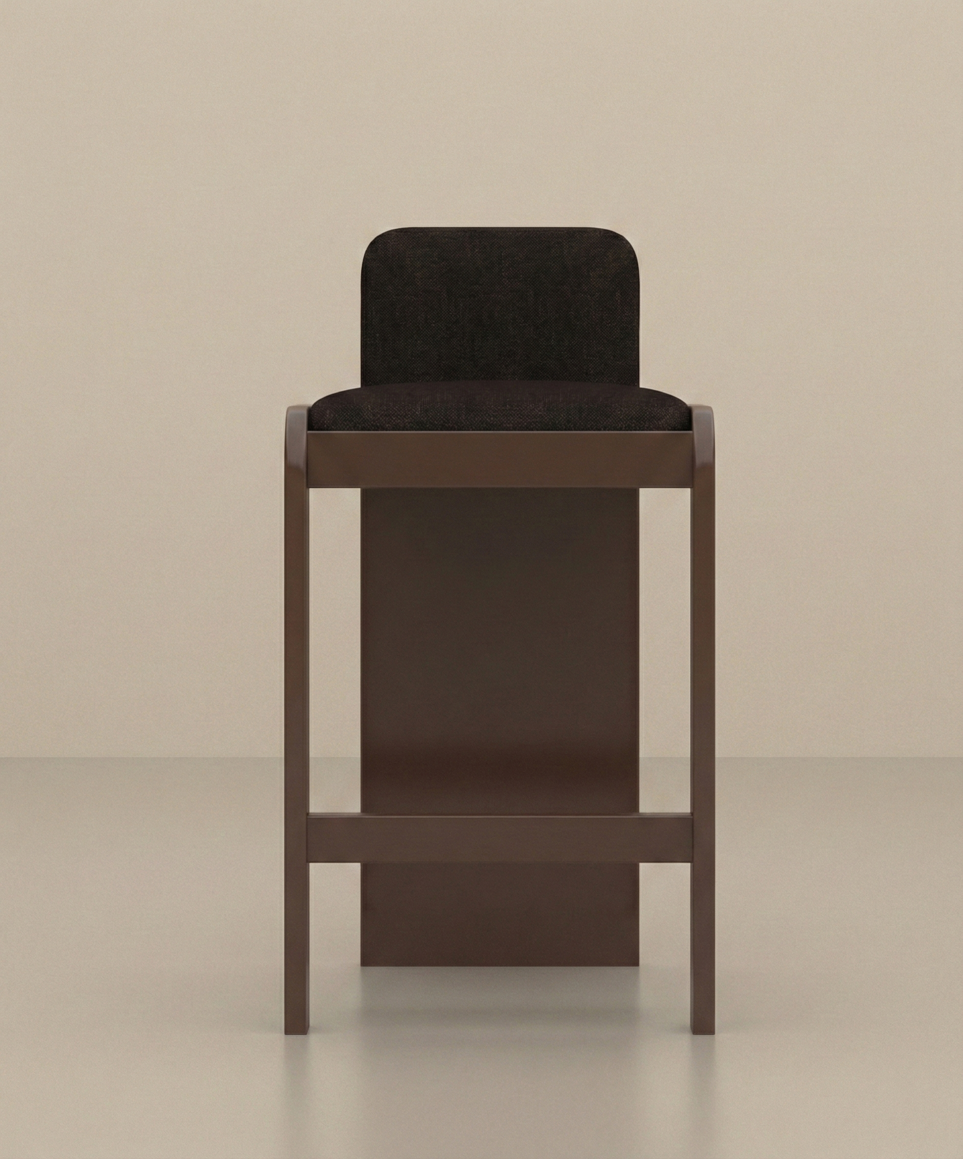 Tabouret haut de bar ou îlot de cuisine en bois laqué Chocolat, assise et dossier confortablement tapissés de mousse haute densité et drap de laine chiné coordonné.