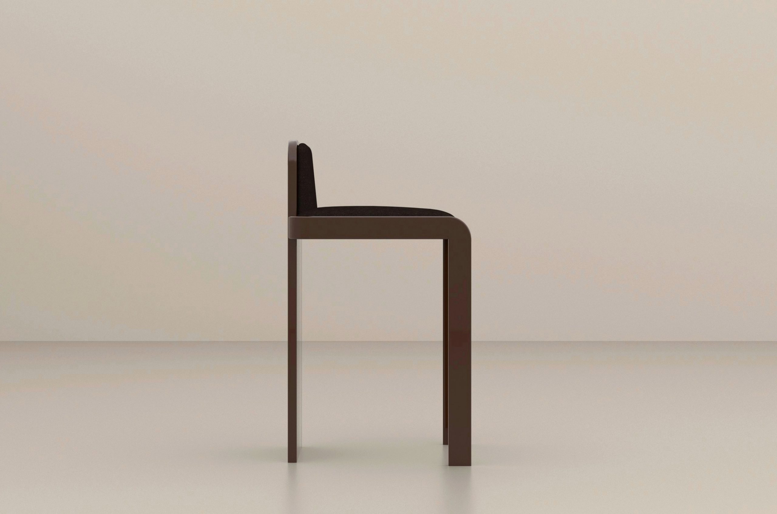 TOTEM 01 : structure en bois laqué Beu Nuit, assise et dossier tapissés mousse haute densité et drap de laine coordonné.